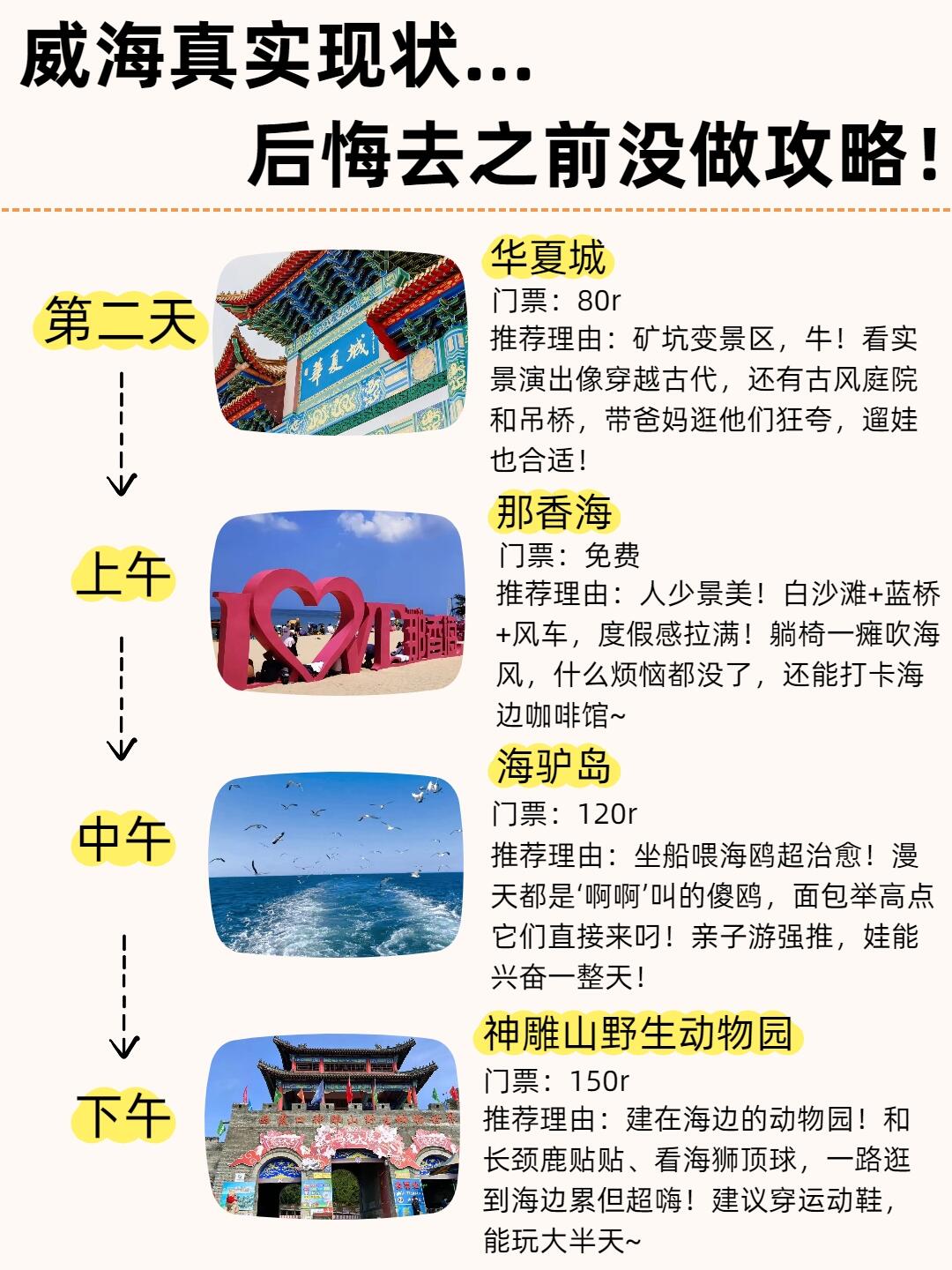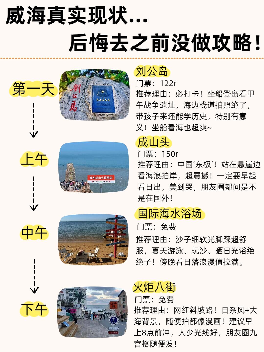 1️⃣第一天直接冲刘公岛,坐船看海🌊,还能参观甲午战争遗址,带娃超合适。下午去成山头看绝#美日出🌅,再到国际海水浴场踩沙踏浪,傍晚在火炬八街邂逅漫画般的落日☀️。