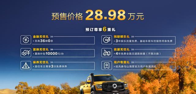 10月19日,长城炮旗下大型非承载式越野皮卡——山海炮性能版在北京金海湖开启全国预售。预售价格28.98万元,新车有两种车身颜色可选,分别为金甲色和黑色。