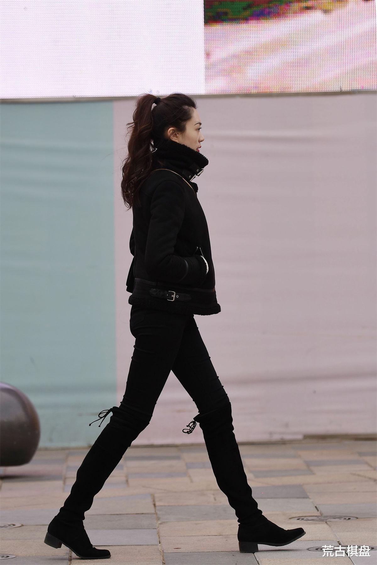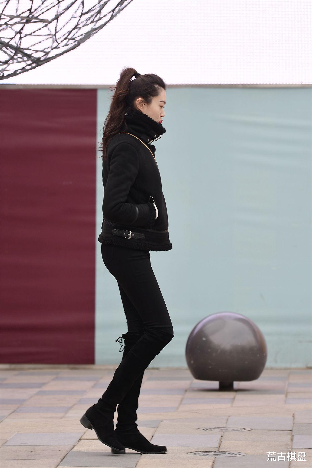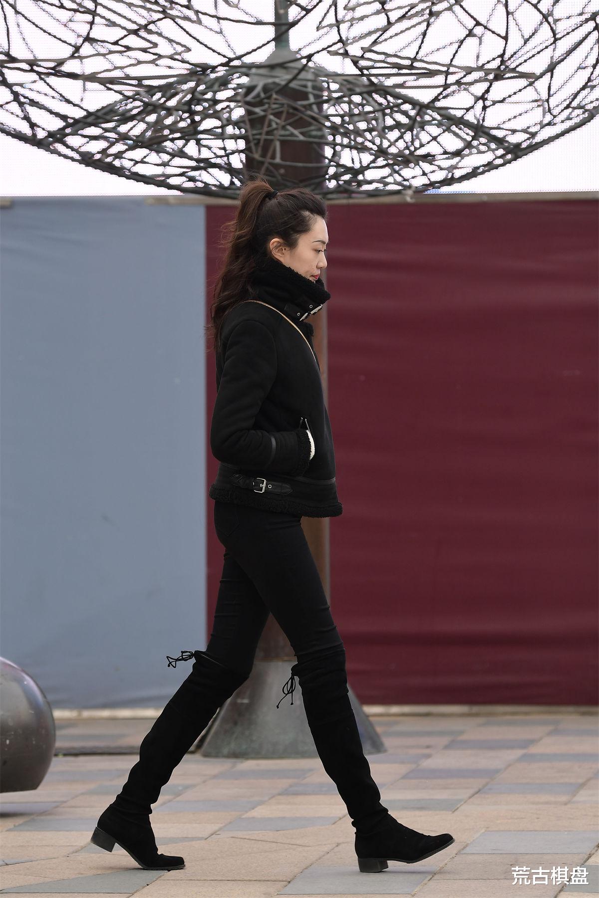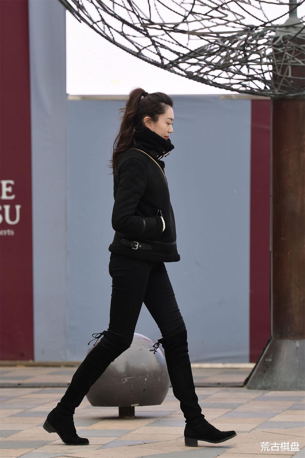 在搭配紧身牛仔裤时,长靴的优势尤为明显。它不仅能够完美衔接裤脚,避免秋冬季节常见的“裤腿灌风”问题,还能通过紧致的包裹感,进一步强调腿部线条的流畅与优美。选择黑色紧身牛仔裤,不仅色彩上与长靴形成统一,更在视觉上形成延伸,让双腿看起来更加修长笔直,是打造“筷子腿”效果的秘密武器。