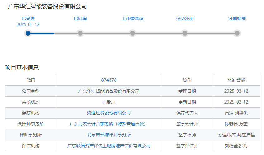 据北交所官网披露,3月12日,北交所受理了广东华汇智能装备股份有限公司(简称“华汇智能”)的IPO申请。