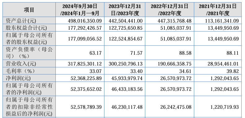 业绩方面,2021年度至2024年1-9月(下称“报告期内”),公司营业收入分别为2,895.45万元、19,066.64万元、30,025.08万元、31,782.53万元;归母净利润分别为129.20万元、2,657.10万元、4,643.32万元、5,237.57万元。