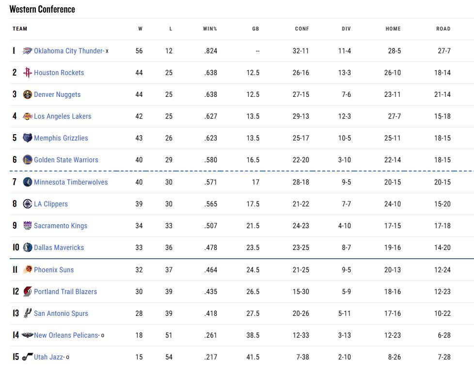 又一个比赛日结束后,在各支球队常规赛还剩13-15场的情况下,西部最新排名如下: