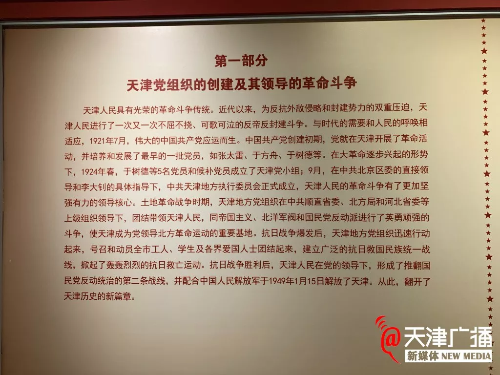 三层的建筑中,共设有五个展览厅,声像厅展出600多幅珍贵历史照片,生动翔实地展示了天津地方党组织在党的英明领导下逐渐发展壮大的革命成长史,真实记录了自五四运动前到改革开放后近百年来,天津地方党组织领导天津人民进行革命、建设和改革开放的奋斗历程。