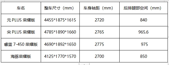 一目了然,除了宋PLUS荣耀版之外,另外三款荣耀版的价格可以说不分伯仲。但在空间方面,这四款车型则展现出了差异巨大的一面。尤其是价格门槛相对更低的睿蓝7-450荣耀版,它以11.77万的价格排在四款车型的最后,且如下图所示,定位紧凑型SUV的它,车身尺寸上是远超元PLUS荣耀版与海豚荣耀版,直逼身为中型SUV的宋PLUS,甚至在轴距方面,比起15万级的宋PLUS更优,真的可以称得上是越级领先。