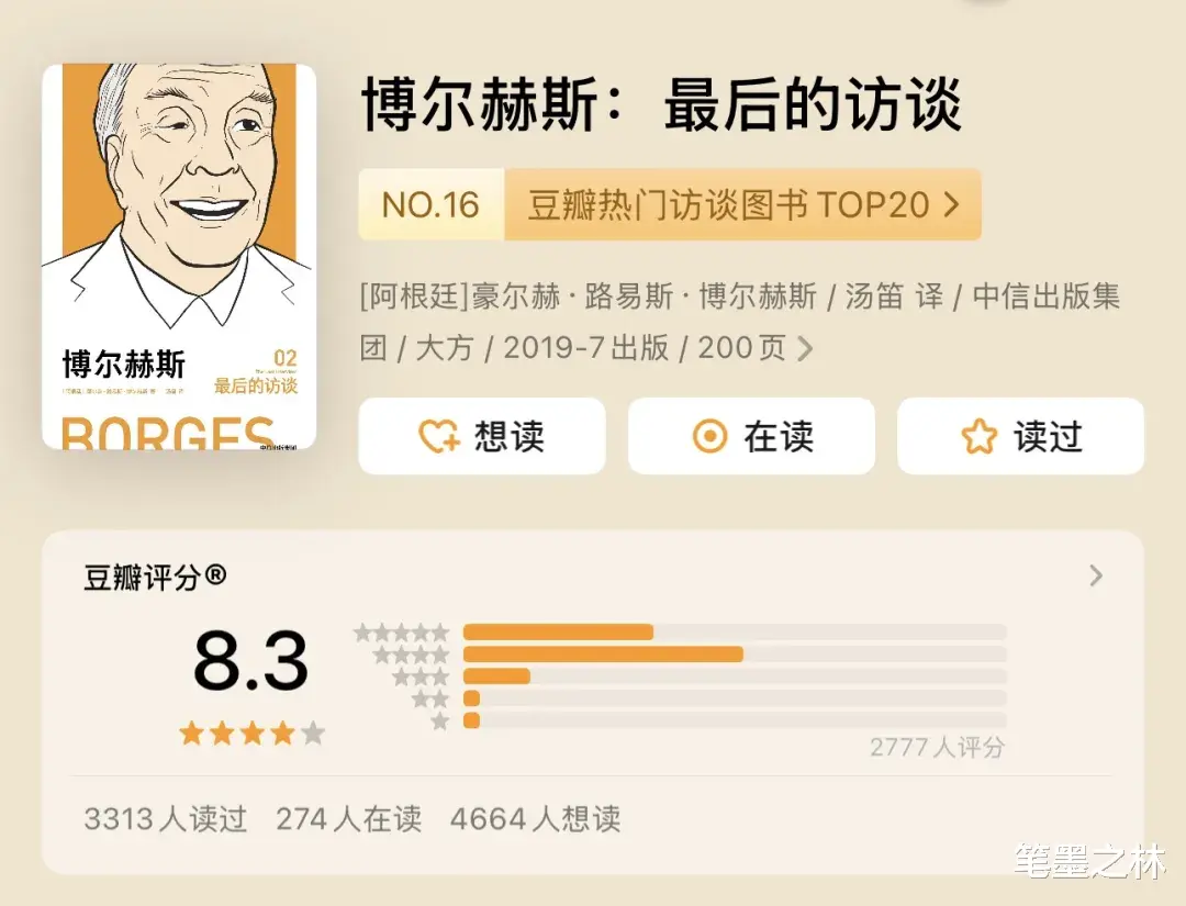深入了解博尔赫斯的作品会发现,它背后那个从世界文学和哲学中广泛摄取养分的人,同时有着否认自身见多识广的谦逊品格。这是一次相当私人的馈飨。通过这些访谈,博尔赫斯似乎在告诉我们,访谈本身就是一个自知的时刻,一个悬停在时间长河中的时刻。--《纽约时报》
