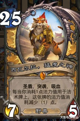 在猛虎之神刚刚发布的时候,很多人都不看好这个逗比,认为25费的卡牌实在太过梦幻,虽然能够通过使用法术给老虎进行减费,但是圣骑士的优质高费法术实在太少,直到最近有玩家开发出了新型的天启骑,猛虎之神终于向世人证明了自己的强度,25点伤害的元气弹更是《炉石传说》中最纯粹的快乐。