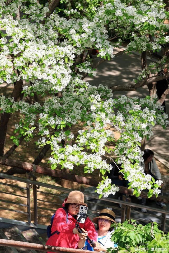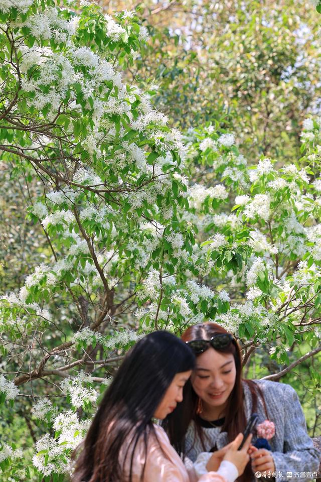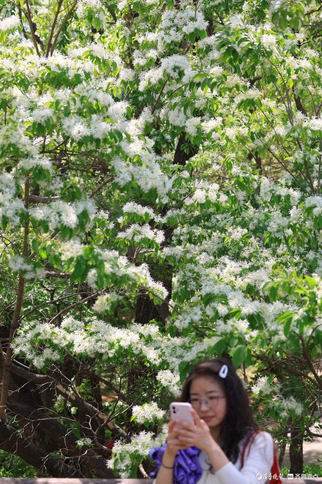 15日,在济南泉城公园,一场春日的“雪景”正悄然上演。流苏树花开如雪,吸引了不少市民驻足欣赏,她们在花下拍照留念,捕捉这如诗如画的美景。 齐鲁晚报·齐鲁壹点 王鑫