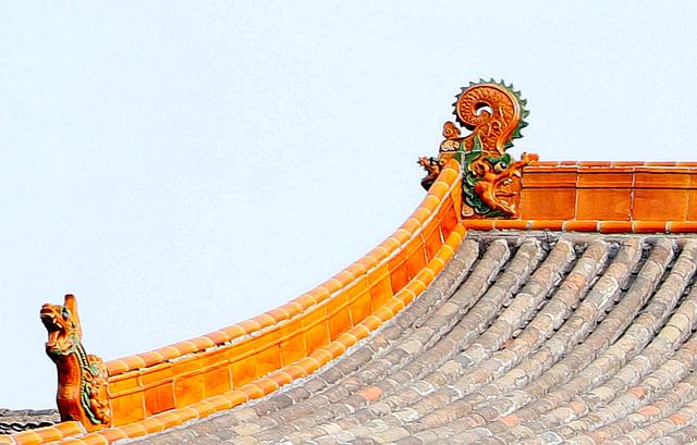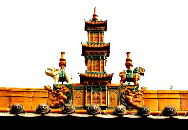 屋脊上的琉璃造型很精美,正脊上是三层楼阁,一边是白象,一边是青狮。