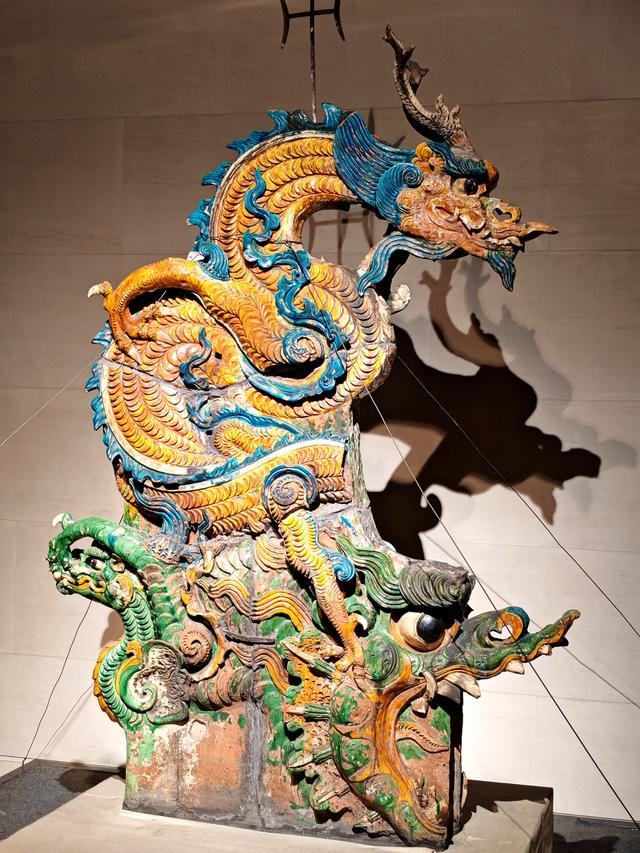 后一天,我在博物馆近距离看见它,大为惊叹,鸱吻高约两米,下面一个大的绿釉龙首,好大的眼睛,上面是一条蓝釉子龙,直立腾飞,造型夸张、奇异,尤其那两个龙爪,大有翻江倒海,气吞山河之势。不得不叹服古人之想象力和工艺水平。想之应该也是几百年前的作品了,小小的石屯村怎么就有了这宝物,同时,也是现在介休博物馆的镇馆之宝。真是令人匪夷所思。