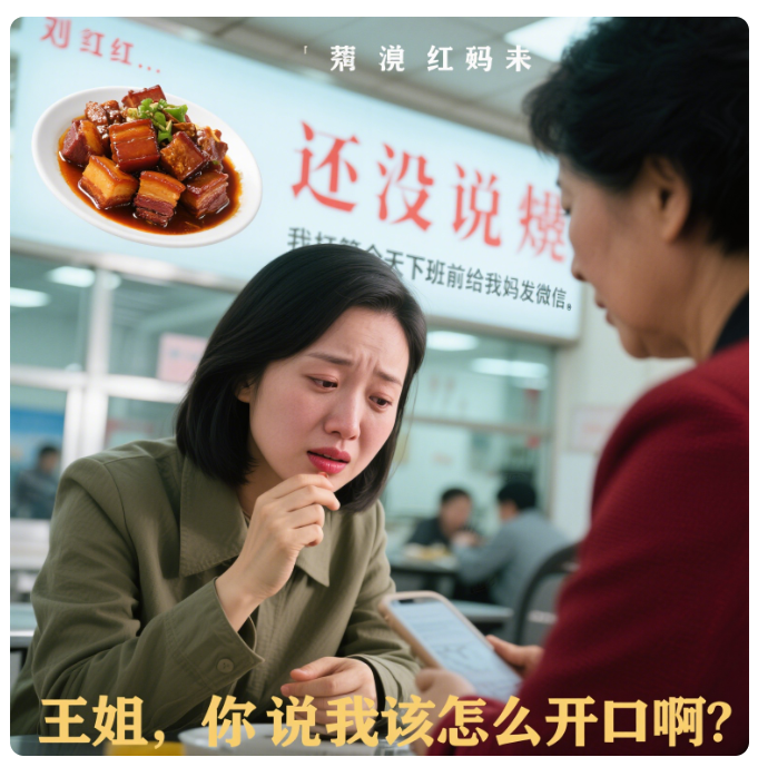 刘颖的脸瞬间红得像我们食堂招牌菜的红烧肉:"还没说...我打算今天下班前给我妈发微信。"她咬着下唇,"王姐,你说我该怎么开口啊?"