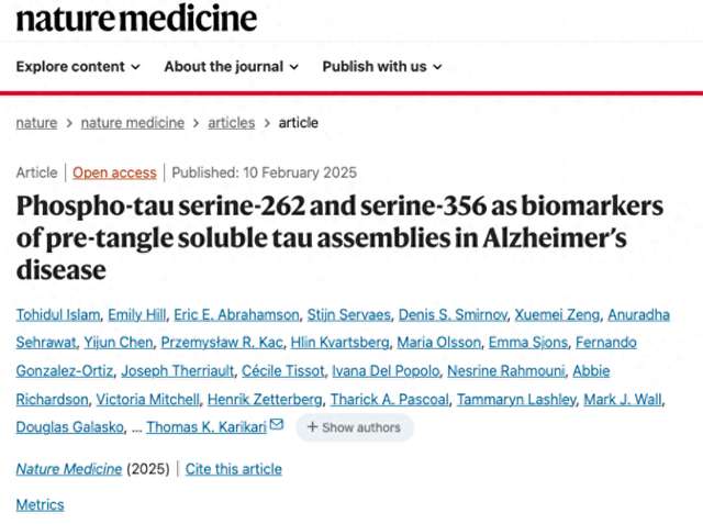 [1]Islam T, Hill E, Abrahamson EE, et al. Phospho-tau serine-262 and serine-356 as biomarkers of pre-tangle soluble tau assemblies in Alzheimer's disease. Nat Med. Published online February 10, 2025. doi:10.1038/s41591-024-03400-0