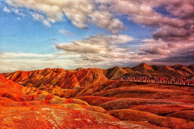 阳光洒在山间,丹霞地貌的红色愈发鲜艳,仿佛燃烧的火焰,令人心潮澎湃。