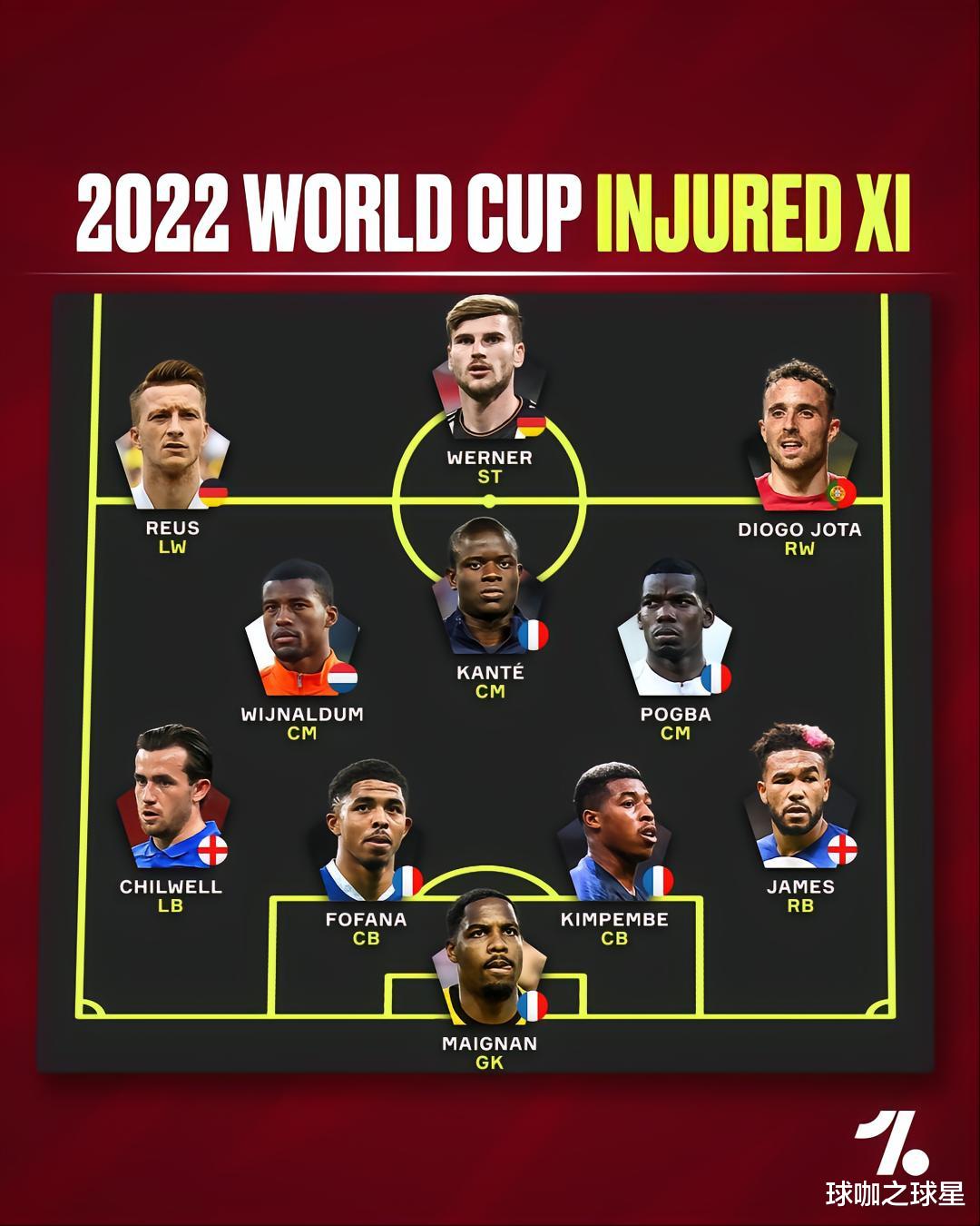 随着2022卡塔尔世界杯揭幕越来越近,近日有媒体统计了因伤缺席本届世界杯的球星们,其中法国队以5人领衔,英格兰2人,德国2人,葡萄牙、荷兰各1人,其中包括博格巴、坎特、里斯詹姆斯、罗伊斯、若塔等名将,有众多球星的缺席,今年的世界杯感觉不那么完整了。一周后,世界杯就将开赛,届时东道主卡塔尔将在揭幕战中迎战厄瓜多尔。然而,足球界的兴奋程度似乎远不及往常。顶级球星的缺席也让许多球迷心碎,随后有媒体把世界杯伤缺的最强11人,列了个首发阵型4-3-3: