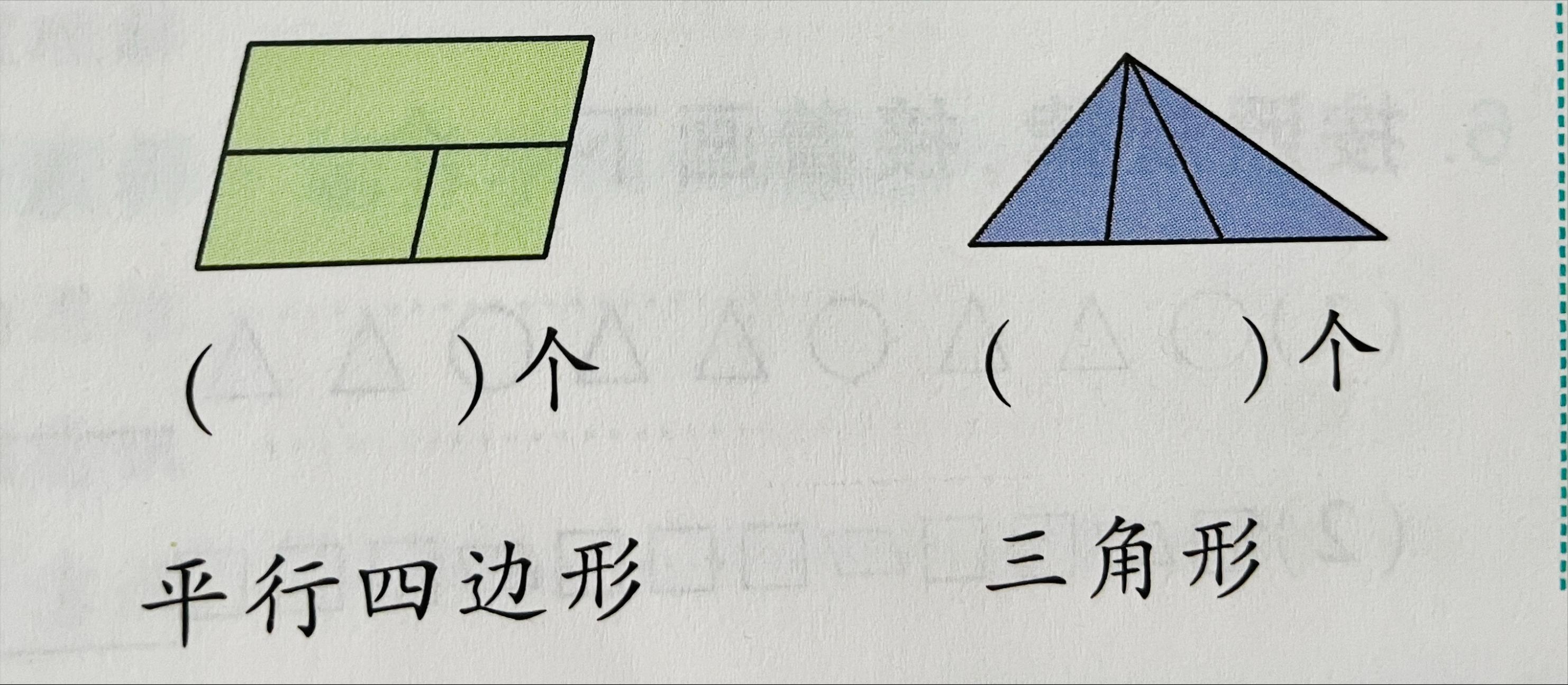 第二类是几个平面图形组合在一起,要求孩子不仅要数出单个图形的个数,还要数出组合出的新图形的个数。