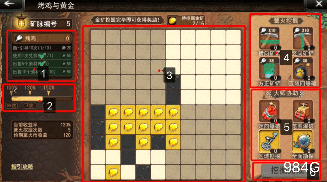 最后的6号区域就是“完成挖掘”按钮,点击后进入下一张矿脉。以上就是G哥首日“乱杀”之后的一些小心得,按照此前大霸的活动设置,只要每日都玩,那么在活动期限内一定能拿到所有奖励,这一点不用急;如果每天参加了“冒险与烤鸡”还拿不齐奖励,我们到时候再看哪些东西值得优先兑换。第一天打完,G哥拿到了1175篝火币。