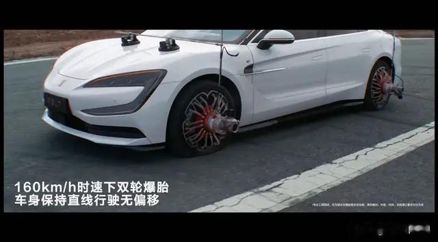 在高速爆胎测试中,160km/h的时速情况下,仰望U7同侧双轮瞬间失压,系统极速调整扭矩分配,使得车身姿态和行进方向可以不受任何影响,160km/h的时速双轮爆胎还能保持直线行驶!