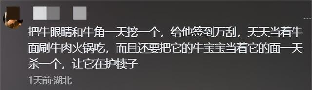 另一位湖北的网友,看完黄牛的做法后,也是深恶痛绝,他说:“把牛眼睛和牛角一天挖一个,给他签到万刮,天天当着牛面刷牛肉火锅吃,而且还要把它的牛宝宝当着它的面一天杀一个,让它在护犊子”,这位网友提供了吃牛肉的多种方法,来解恨。