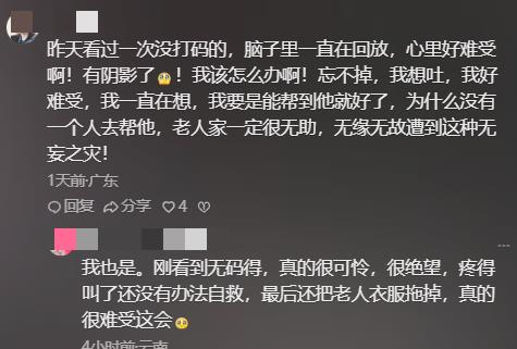 之后,一位云南的网友也有同感,他说:“我也是,刚看到无码得,真的很可怜,很绝望,疼得叫了还没有办法自救,最后还把老人衣服脱掉,真的很难受这会”。
