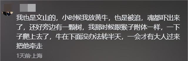 一位IP地址为上海的网友分享了自己小时候放黄牛的经历,他说:“我也是文山的,小时候我放黄牛,也是被追,魂都吓出来了,还好旁边有一棵树,我那时候跟猴子附体一样,一下子爬上去了,牛在下面没办法转半天,一会才有大人过来把他牵走”。