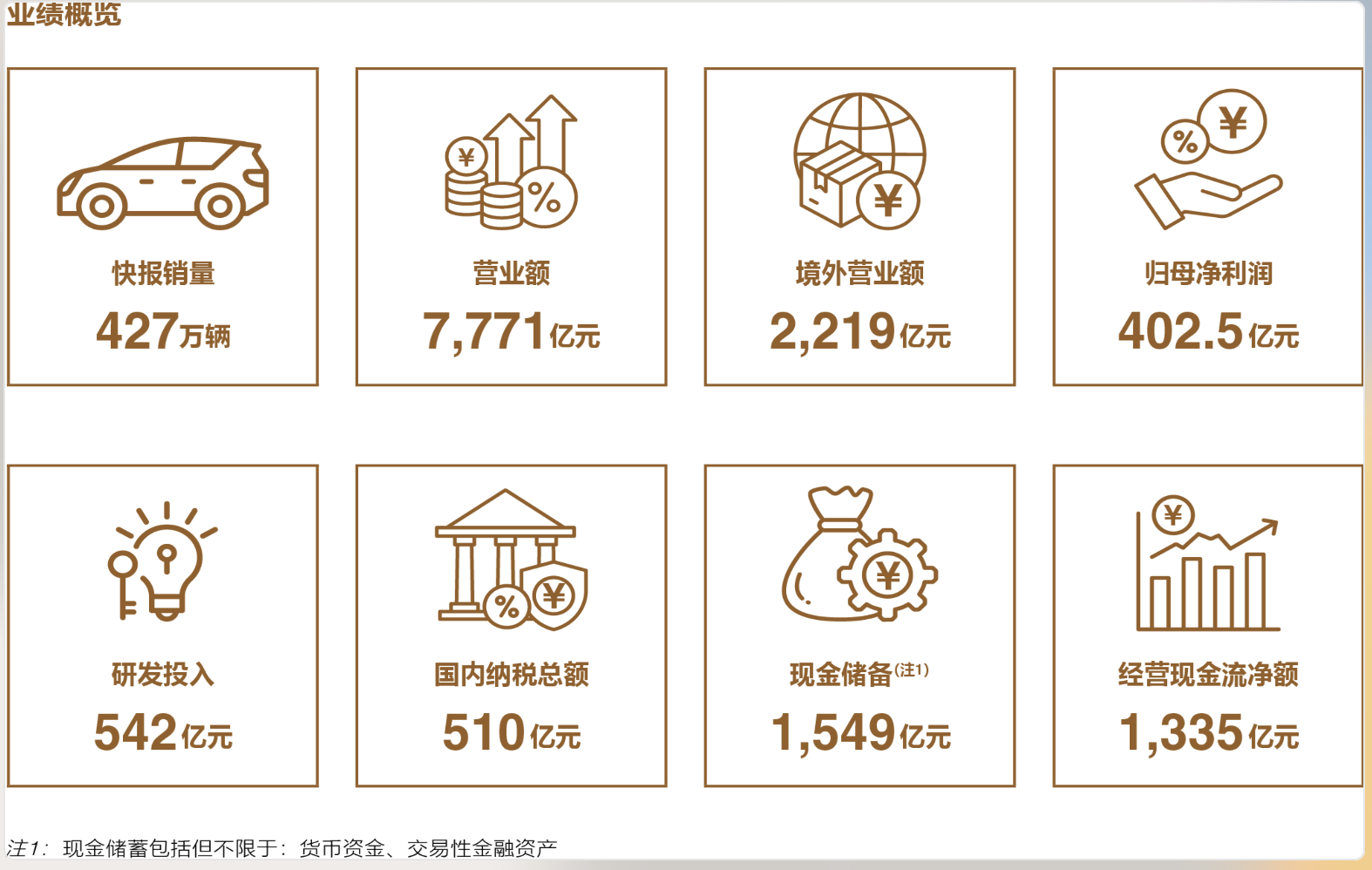 2024年比亚迪交出史上最强成绩单:全年营收7771亿元,同比增长29%;归母净利润402.5亿元,同比增34%,核心经营指标全面刷新纪录。业绩高增背后,研发投入持续领跑行业,全年研发支出542亿元,同比增36%,14年累计研发超1800亿元,推动第五代DM、天神之眼智驾等核心技术落地。全球销量达427万辆,市占率稳居全球第四。财务表现愈发稳健,现金储备攀升至1549亿元,有息负债占比降至4.9%,行业最低。年内完成435亿港元闪电配售,进一步巩固资本实力。供应链合作深化,应付账款周转天数127天,显著短于行业均值,共赢生态成型。业绩与创新双轮驱动下,比亚迪在电动化、智能化领域持续领跑,可以说,2024 年比亚迪表现相当亮眼。站在普通用户的角度,期待 2025 年能给大家带来更多高性价比的优秀产品。
