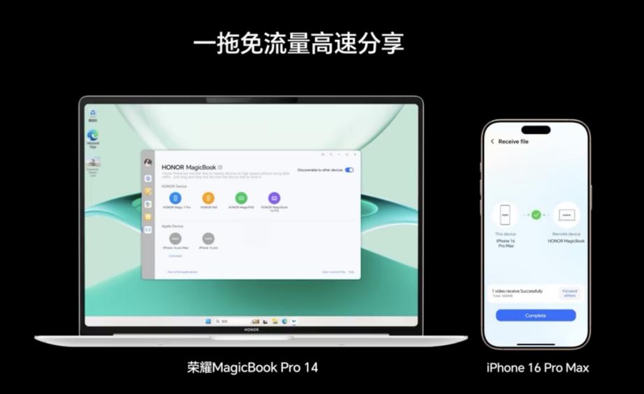 从生态互联方面来看,荣耀推出了首个全生态文件共享技术,重构设备互联的游戏规则——无论是单台设备间的文件传输,还是跨iOS与Android等多操作系统设备间的文件传输,其均能实现高速传输体验,有如互联网早期的TCP/IP协议那般,对封闭生态降维打击。