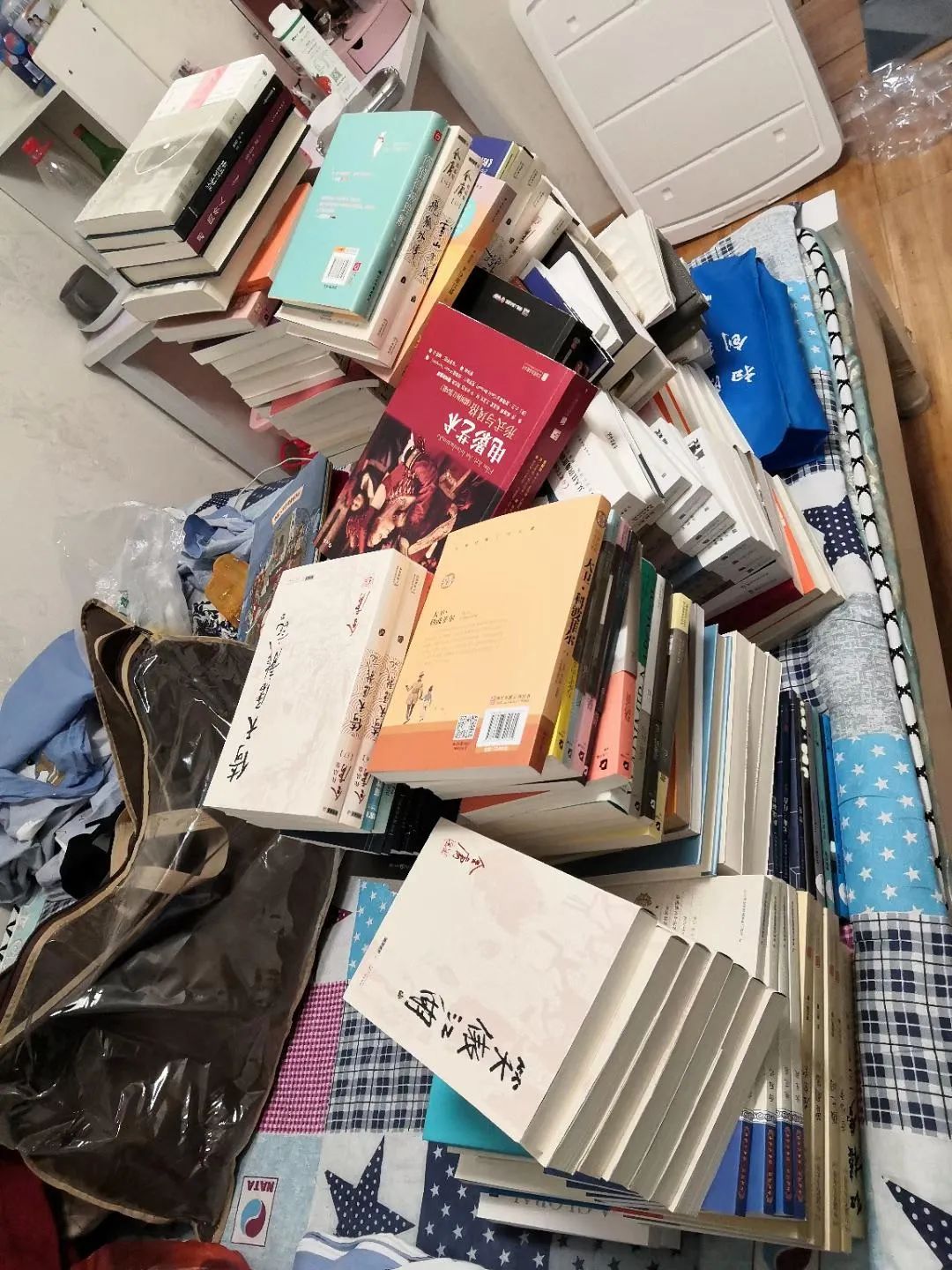 打开灯一看,原来是书柜倒了,金庸全集散落一地,书里的郭靖和黄蓉好像窥探着尴尬的一切。