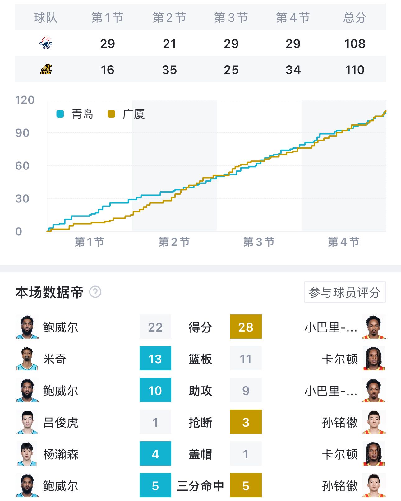 鲍威尔:22分4板10助,关键三分扳平,最后超远一投险创奇迹王睿泽:21分2板1助,外线持续输出段昂君15分、米奇14分13板、杨瀚森14分4板4助4帽韦瑟斯庞10分6板7助,赵嘉义6分,吕俊虎6分广厦队: