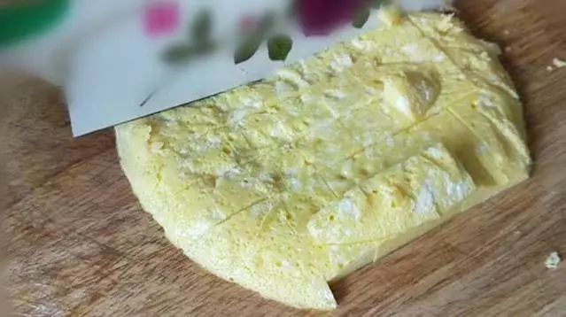5、将蒸好的鸡蛋取出来,在盘子的四周用刀划一圈,然后将蒸好的鸡蛋翻倒在案板上,用刀切成一块,类似一样大小的块放在碗中备用;