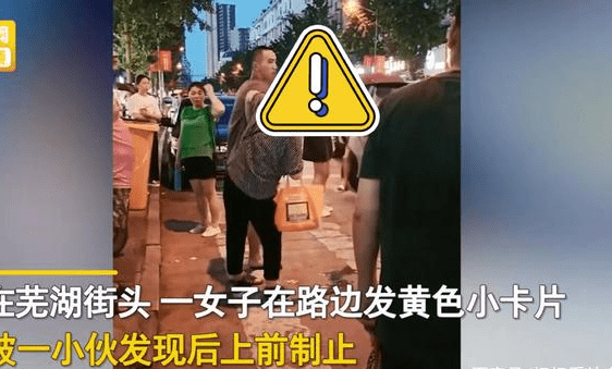 小伙子拦截女子的去路,一边举着卡片,一边叫嚷着:“大伙儿来看看,这是什么!”原来女孩发放的竟然是“yellow”卡片,上面的内容更是让人无言以对。
