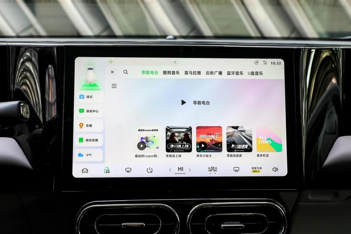 内饰方面,零跑C11增程的科技感同样出色,拥有10.25英寸仪表盘+12.8英寸中控车机屏+10.25英寸副驾娱乐屏组成的三联屏,控屏和副驾屏能分屏观看不同内容,不影响主驾驶乘客听取导航信息。同时车机内置骁龙8155芯片,搭载了Leapmotor Os车载智能系统,全系支持车联网OTA升级等。不足的是,虽然采用三联屏设计,但是屏幕整体显示的清晰度并不是很出色,而且操作的流畅性上并不出色,车机系统和UI都有优化的空间,当然它的潜力是非常大的。