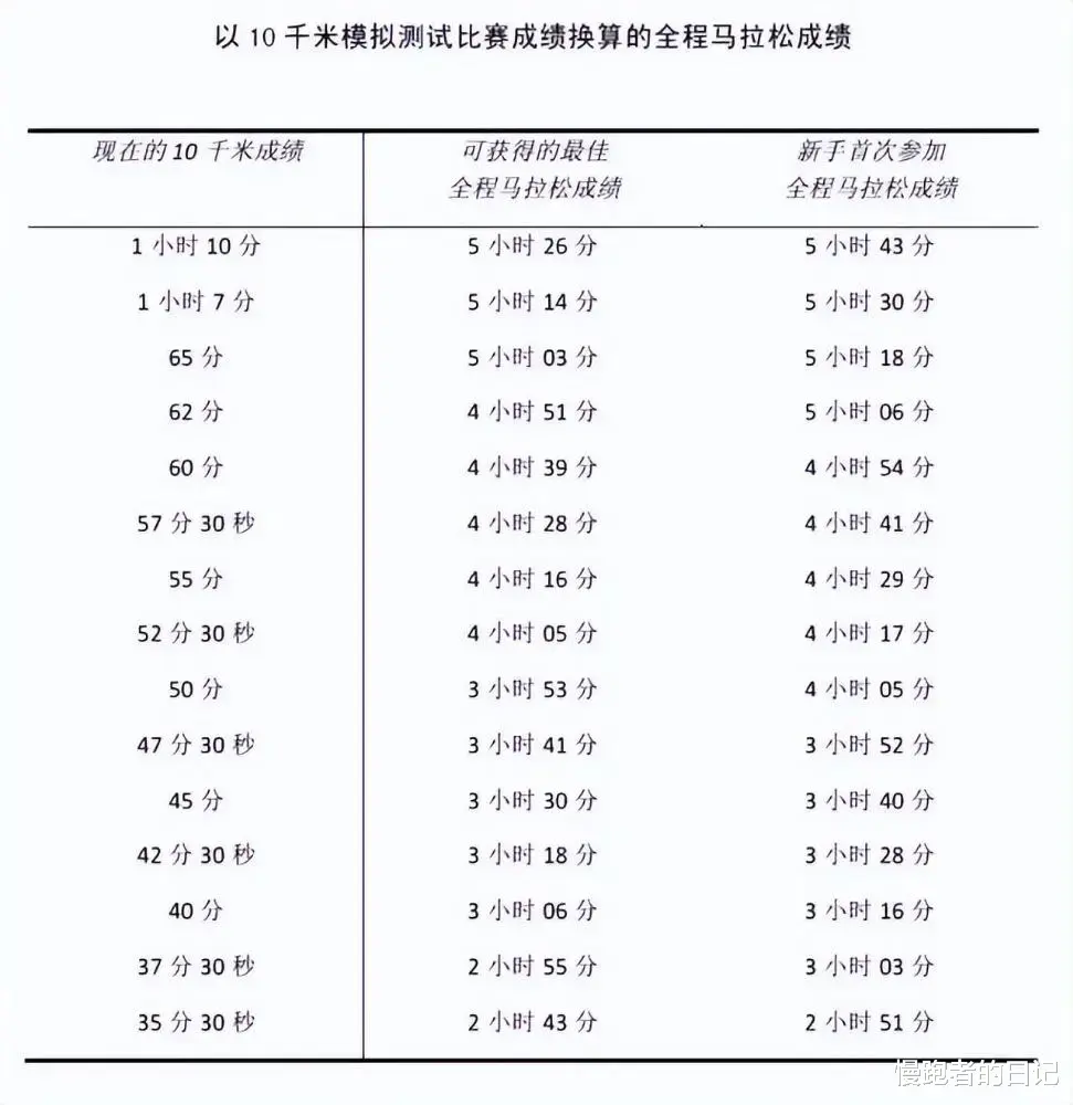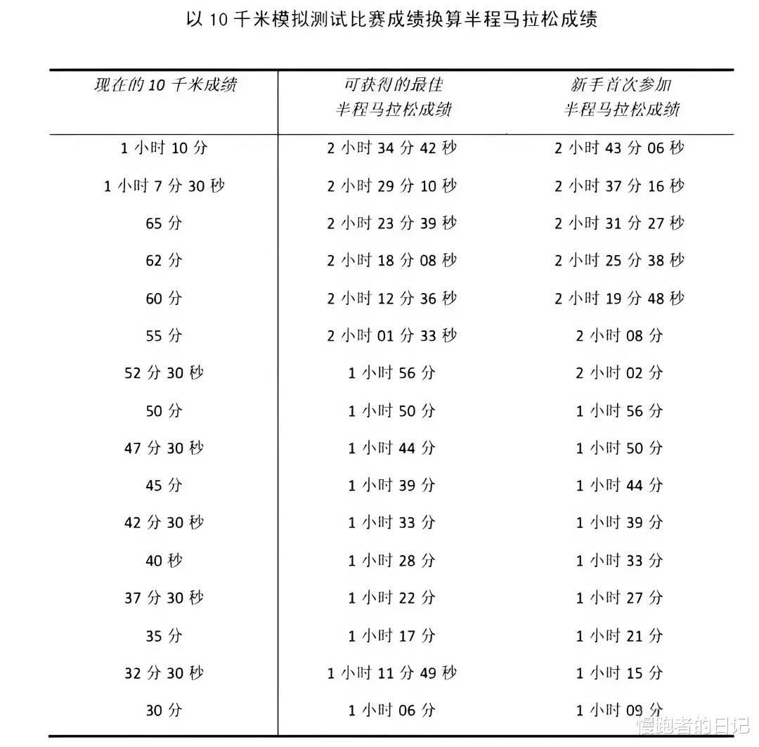 在《跑步圣经》中,曾汇总出过这样一则数据,以10公里模拟测出来预测的半马、全马成绩:
