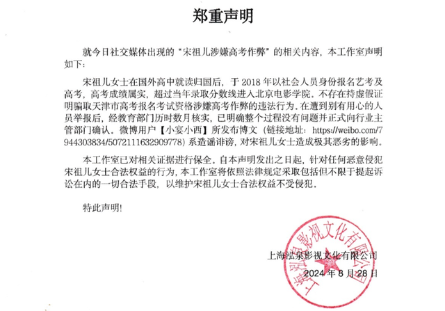 其一,针对偷税漏税,经官方检测机构证实,此为不实传言;其二,关于高考作弊,声明强调宋祖儿成绩真实有效,不存在作弊行为,还提及经常在微博爆料的 “小宴小西”,而该博主账号已被官方处理。