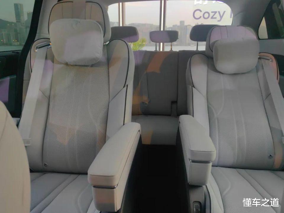 新车提供2+2+3座椅布局,第二排两个独立座椅,支持选装二排零重力太空沙发,二排两个座位前方均配有小桌板。提供21.4英寸吸顶屏,也配置莱茵认证护眼防蓝光,提供50瓦手机无线充电、伸缩式杯托、折叠桌板、车载冰箱、老板键,车内220伏电源接口,儿童座椅接口增加至4个,车辆V2L外放电功率6千瓦。新增带第二排零重力座椅的过道版车型。