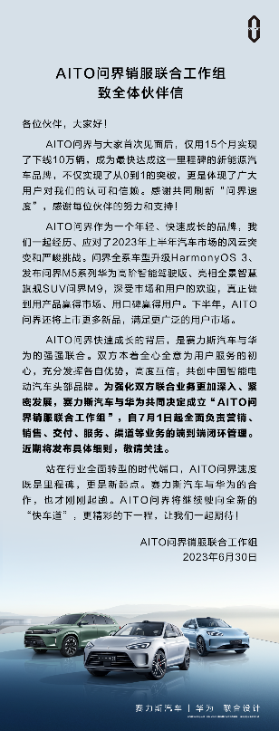 6月30日,AITO问界发布致全体合作伙伴的一封内部信,表示为了进一步支持赛力斯汽车与华为联合业务的深入发展,双方决定成立“AITO问界销服联合工作组”,负责营销、销售、交付和服务等业务的端到端闭环管理。这一举措是汽车企业和科技公司跨界融合、深化合作的重要里程碑事件,也展现了赛力斯汽车和华为在智能汽车领域的深度合作和共赢愿景。