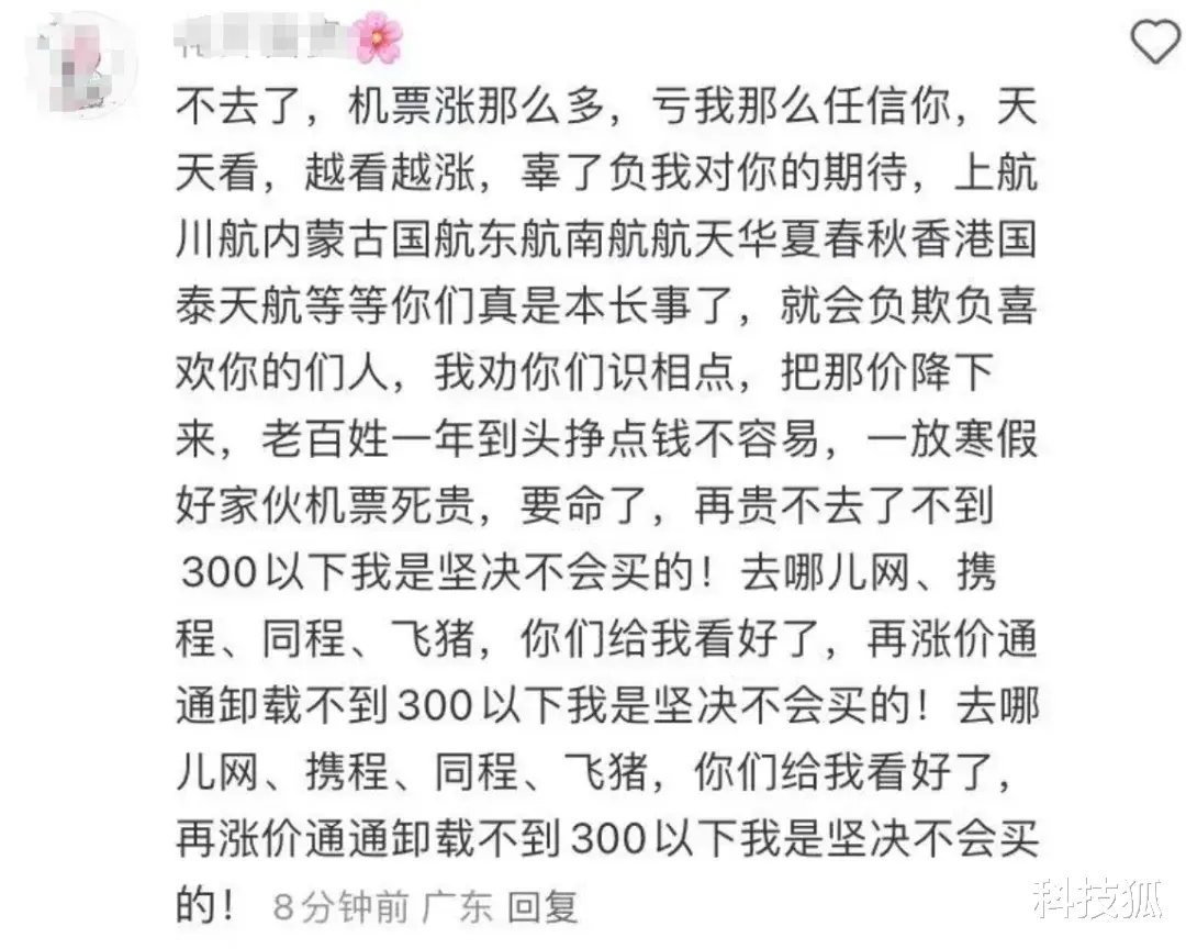 事情的起因是,有网友嫌弃机票贵得离谱,就对着手机不停抱怨,还忍不住跑到各平台评论区反复吐槽“机票太贵,根本买不起”。