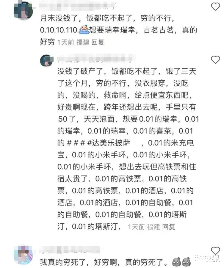 于是,#评论区哭穷,下单能便宜#的话题很快就上了热搜。大家都开始跟风去评论,拼命展示自己有多穷苦,跪求各大平台给点便宜东西,最好是 0.01 元就能带回家那种。