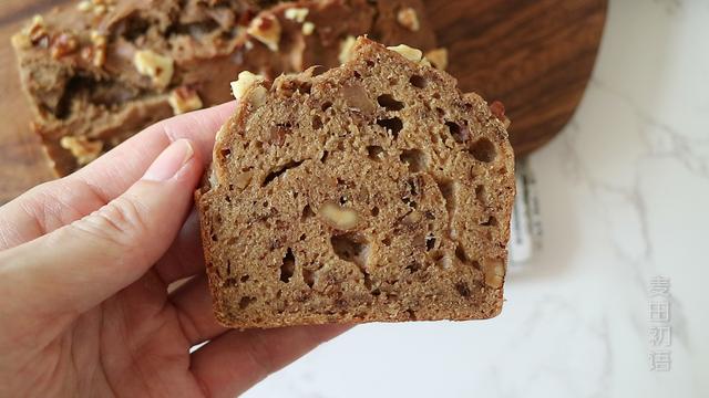 烘烤到位的蛋糕表面呈深棕色,并且裂缝明显,用牙签插入蛋糕不会带出生面糊。移出烤箱,脱模放在晾网上冷却。完全冷却后用保鲜膜包好密封冷藏,放置一天后的蛋糕会更美味。切开蛋糕能看到大小不一的气孔与核桃颗粒,组织间散发出香蕉与红糖的独特风味。