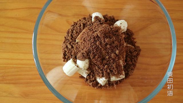 香蕉要选用比较熟的(外皮有黑点),去皮后掰成小段,加入搅拌盆中。然后加入红糖和食盐,用电动打蛋器充分搅拌成泥。成熟香蕉的75%都是水分,所以最后它会变成液体。接着再加入全蛋液、牛奶、植物油,充分搅拌均匀。