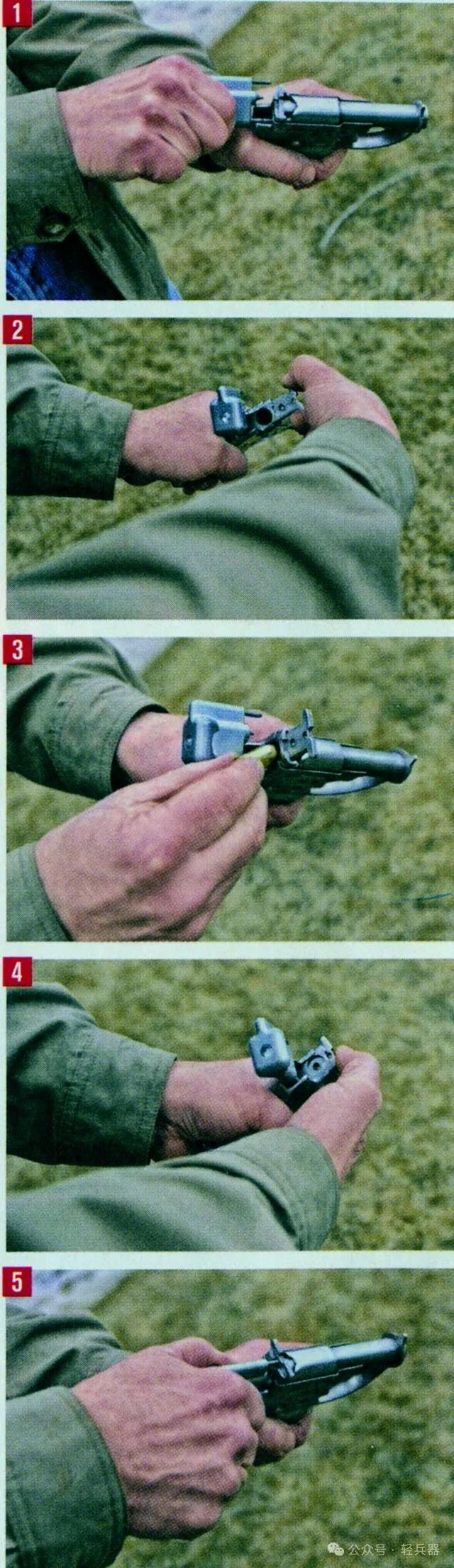 ①将待击尾块拉向后方的同时将其向左旋转至水平位置,此时即可露出枪管尾端的挡板;②用两根手指分别捏住该挡板底部突出的两端而将挡板向上提起,露出弹膛。当弹膛完整露出后,松开手指即可将该挡板固定在上方位置;③ 向弹膛内装入一发枪弹;④ 用手指将挡板按压回原来位置;⑤再将待击尾块复位,枪即处于待击状态,瞄准后扣动扳机射击即可