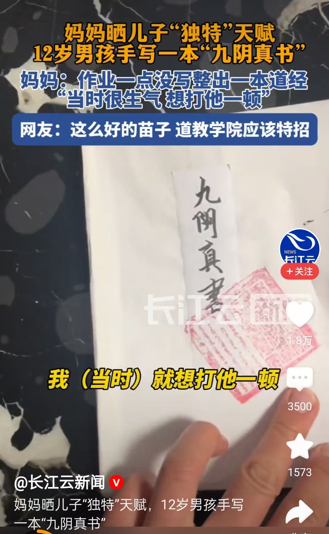 最近,江湖里又有了一件让人瞠目结舌的事:一个12岁的少年竟然手抄了《九阴真经》!这本书在金庸的武侠世界里可是赫赫有名,多少英雄为它争得头破血流,江湖恩怨也离不开它。这孩子为什么会这样做?他有什么样的故事呢?也许这是一个孩子对武侠世界的无限热爱与憧憬。他的行为让人不禁想起,那股对梦想的执着力量,真是让人感动。