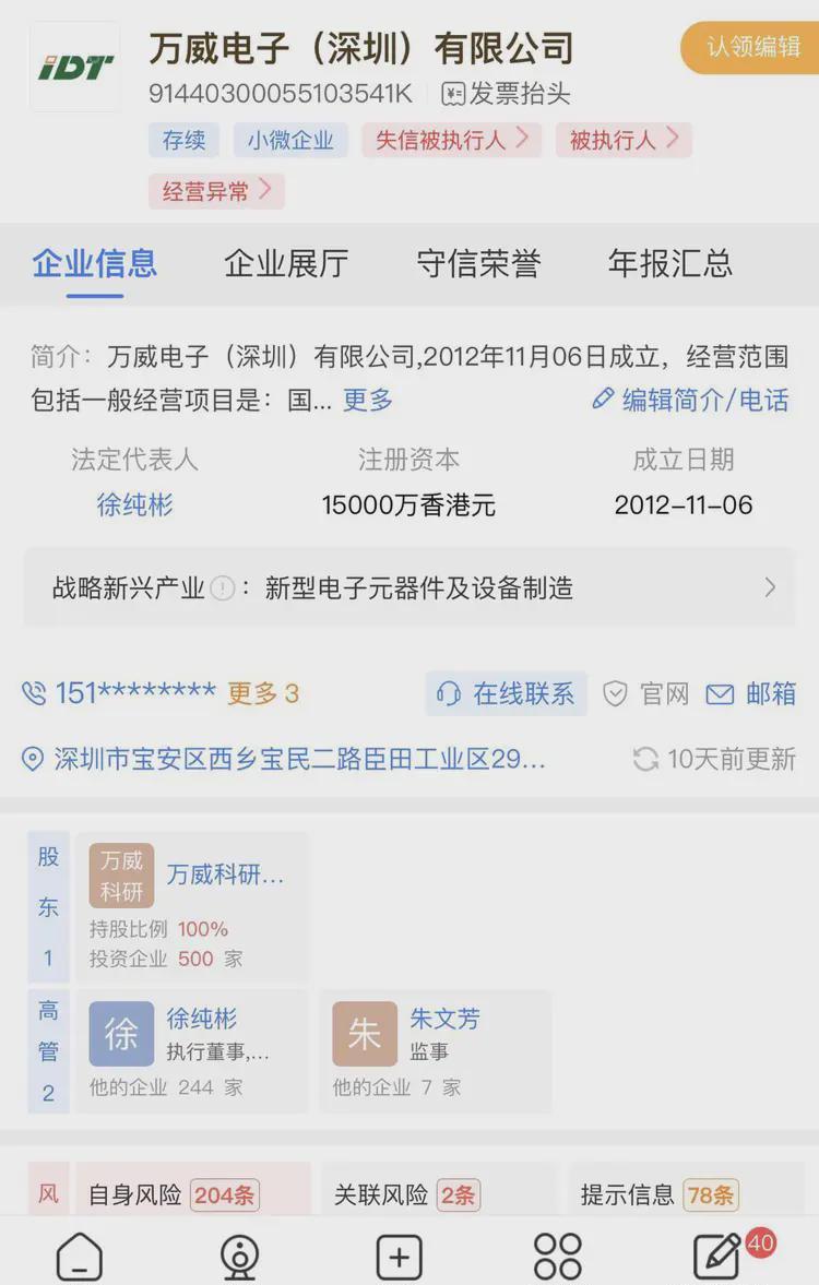 据公开资料显示,万威电子(深圳)有限公司2012年11月成立。注册资本高达1.5亿港币,位于深圳宝安西乡。
