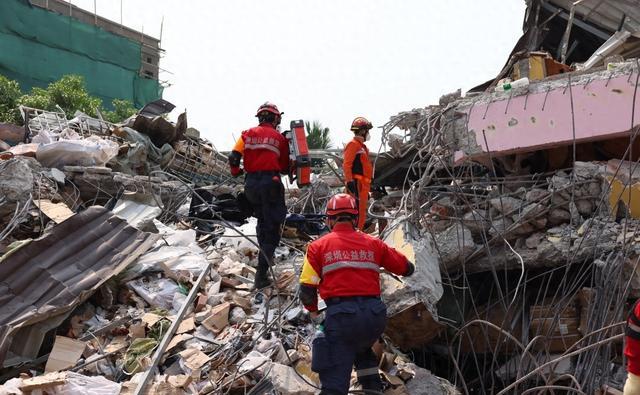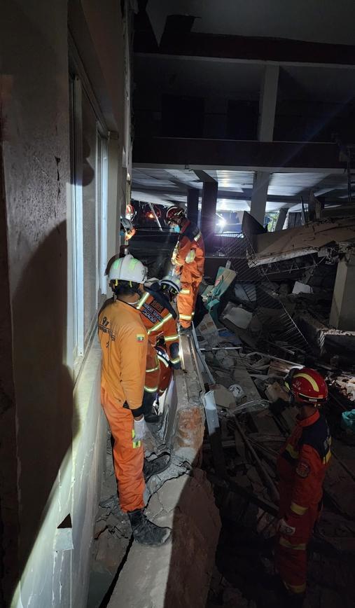 救援现场很多都是摇摇欲坠的楼体,我方救援人员不顾危险在里面搜寻生命。