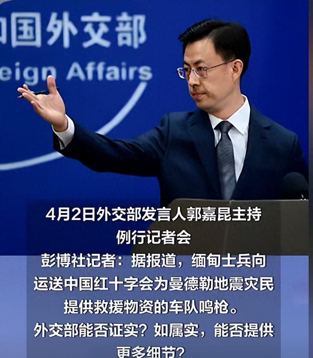 彭博社的记者向我国外交部发言人提问“有消息称中国救灾车队在缅甸被军队鸣枪,请问消息是否属实?”