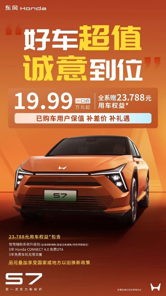 4月15日,东风本田宣布旗下首款纯电高端SUV——S7正式推出无套路一口价政策,新车全系价格直降至19.99万-24.99万元,同步释放价值23,788元的用车权益,涵盖智驾辅助升级、5年免费OTA及5年免费车机无限流量等硬核权益。更具行业标杆意义的是,品牌同步推出老用户保值计划,为调价前购车用户全额补差价并追加礼遇,以 “双向奔赴” 的诚意,重塑合资纯电市场 “高质价比” 新标杆。