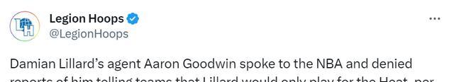 此前有报道称,利拉德和他的经纪人古德温,已经用多种方式告知外界,利拉德只想去热火打球。但利拉德的经纪人古德温在接受采访时否认了这一说法,他表示他并没有告诉其他球队利拉德只为热火效力。现在看来,迫于联盟的压力,利拉德可能要改变自己的立场了。