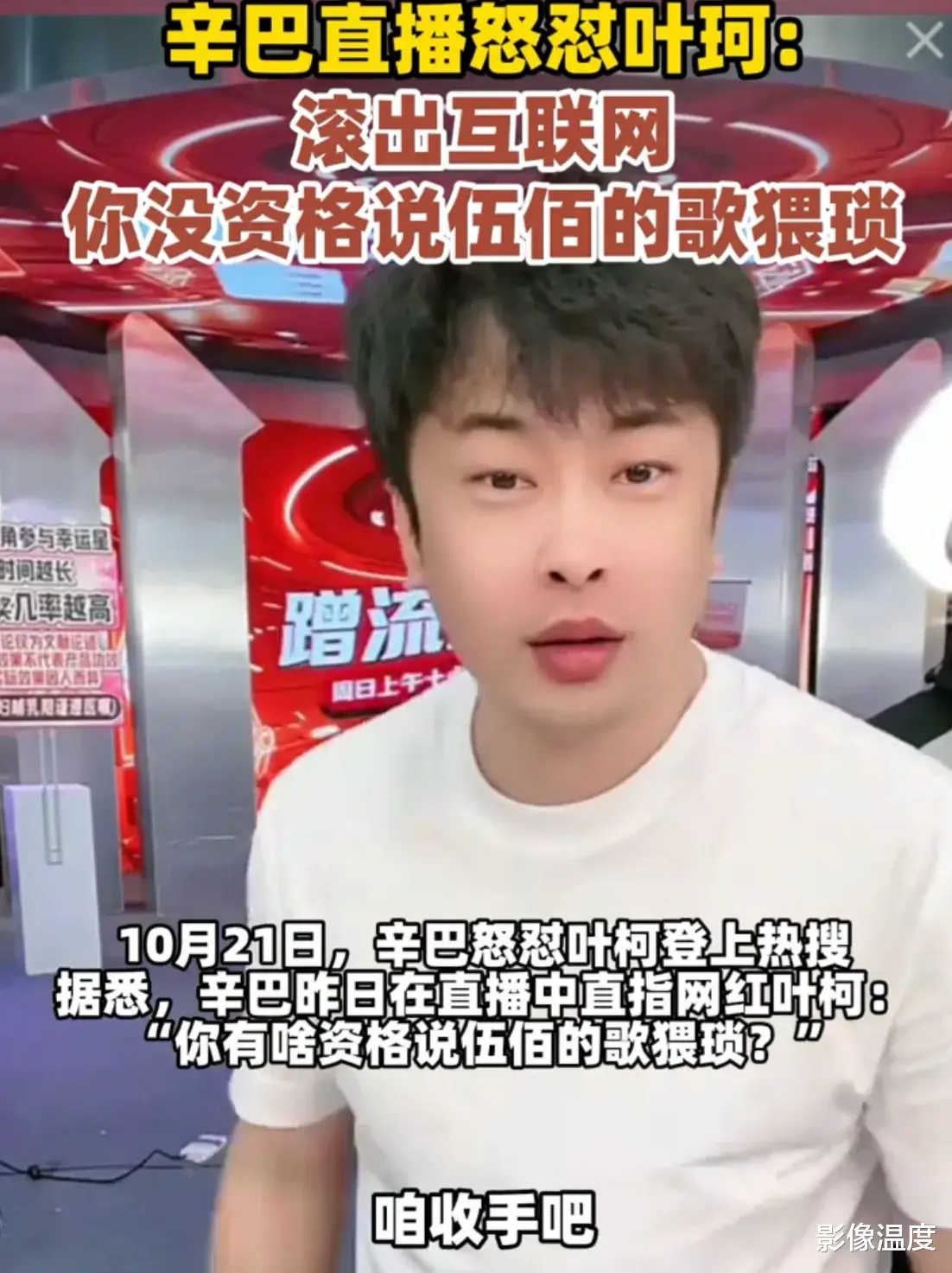 他说,伍佰这个人长得不好看,但是他的歌是我听到最好的歌,你说他的歌猥琐,我就是听他猥琐的歌长大的,我叫辛有志,我今天替80后和90后说一句公道话,你叫叶柯,你是个什么东西,把自己装成名媛,你是个干什么的?你有什么资格评价伍佰,你给我滚出互联网,你这个垃圾人,女人里面的LJ,女人活成你这样都丢人,你不知道自己丢人吗?你不是要热度吗?我给你热度你敢接吗?刀郎和伍佰是长得不好看,他们的歌陪伴了很多人,他们老了,所以我们现在要爱他们,不爱他们就没有机会了,叶柯你装什么装,你给我滚出互联网!