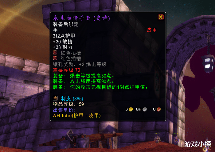 永生幽暗手套拥有30敏捷、33暴击、154破甲和90攻强,以及两个红孔。两件装备的孔位+破甲+暴击的价值基本可以互相抵消,但是永生幽暗手套的30敏捷+90AP,就明显比边疆手套的47力量强力很多,按照玩家Airjs提供的DPS模型,30敏捷+90AP=30*1.55+90=136AP,47力量=103AP,两者差距33AP。
