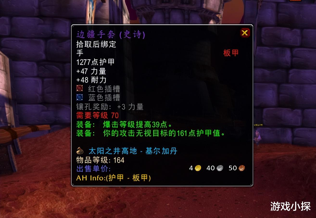 边疆手套拥有47力量、39暴击和161破甲,以及两个孔,164装等的鸡蛋板甲手套确实看起来很美好,但是和永生幽暗手套一比较就不够看了。