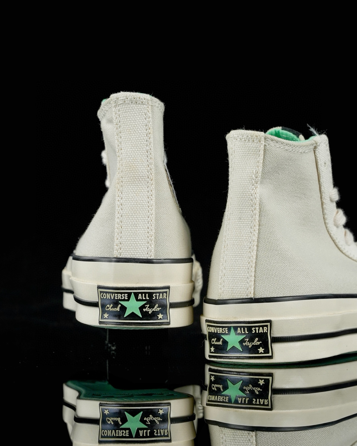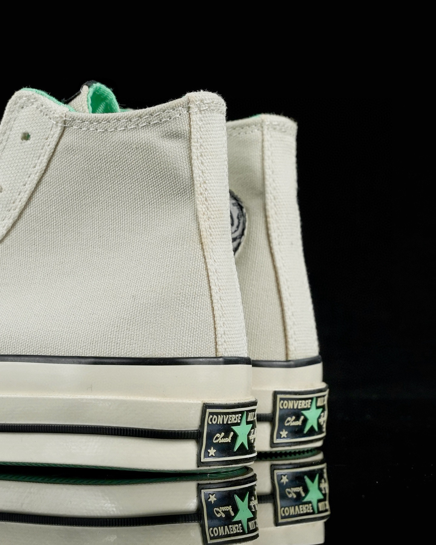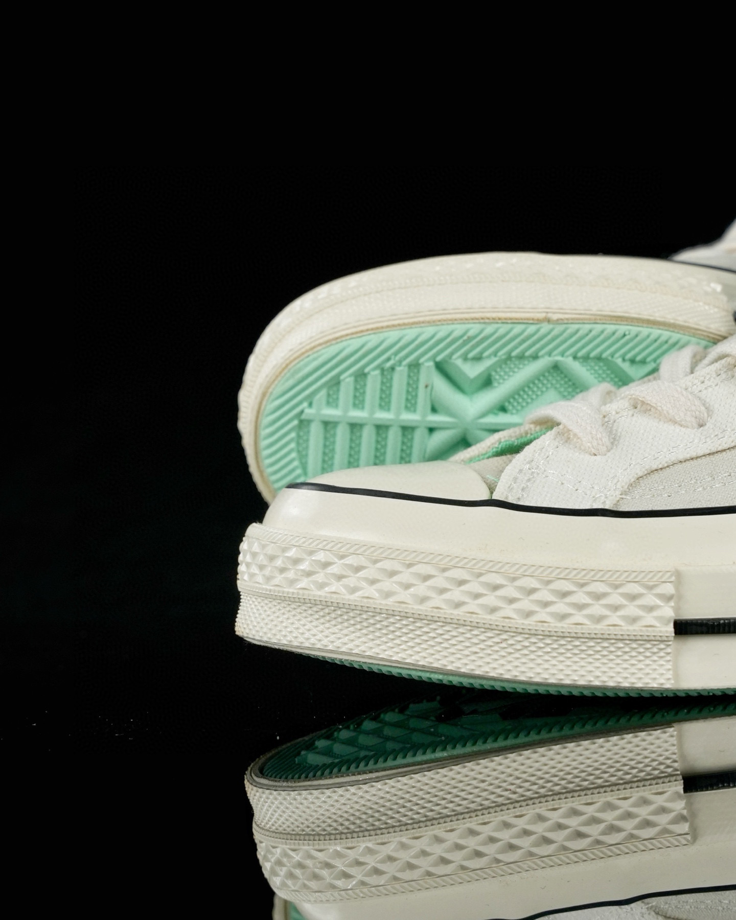 匡威70s新配色来喽,这个颜色也太高级了吧,浅灰色和白色的拼接色内里透出淡淡的果绿色,上脚简直不要太哇塞啦!