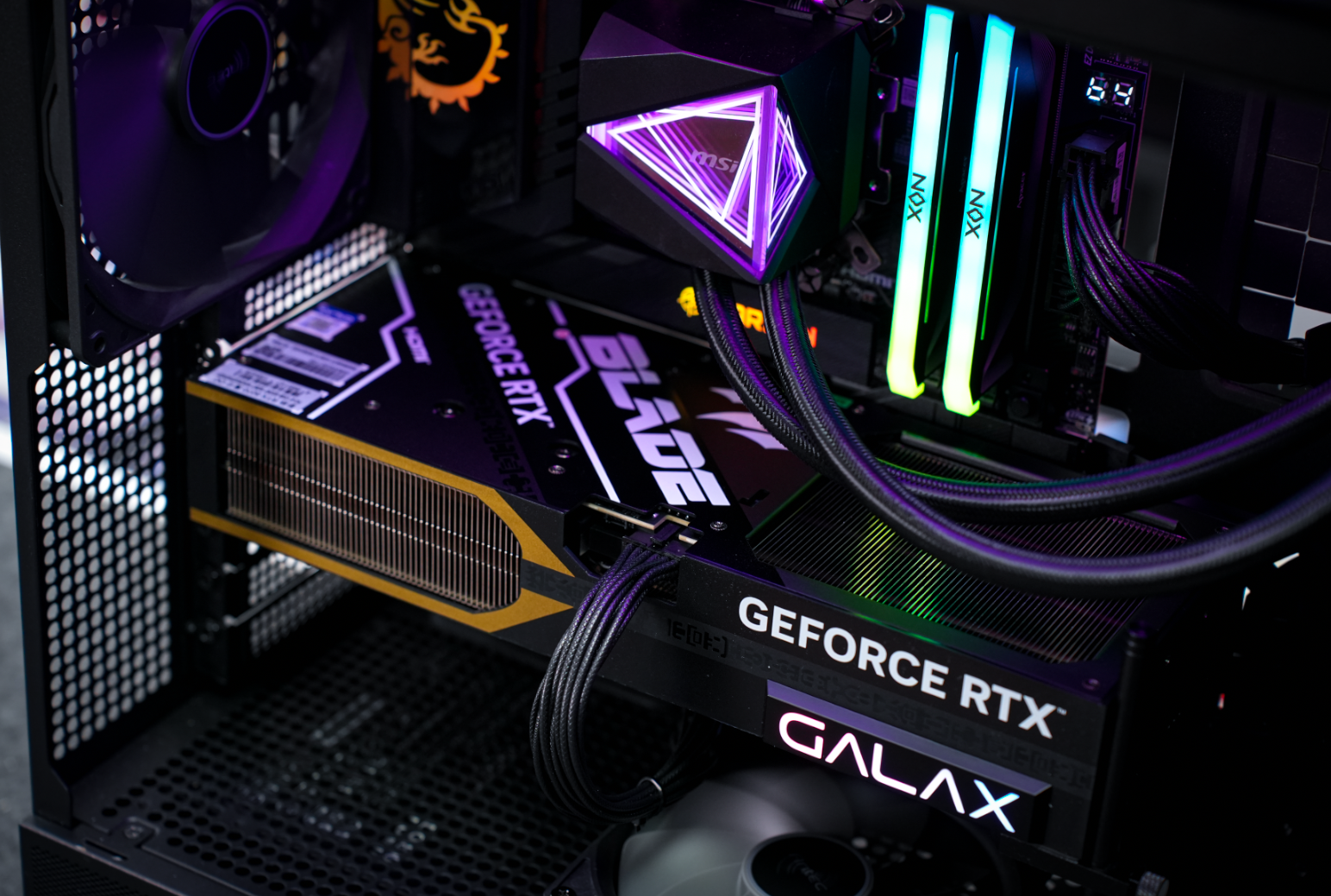 而说到散热,就不得不说影驰这次的刃x圣散热系统,实测过之前几款显卡的表现确实很不错(下方也有拷机实测)。其采用的是3个90mm静霜风扇,内部则搭载了4根镀镍复合热管。同时,为了进一步增大风压和降低风噪,显卡的扇叶也经过了三折扇叶设计,并且支持智能启停技术,可进一步延长风扇的使用寿命。